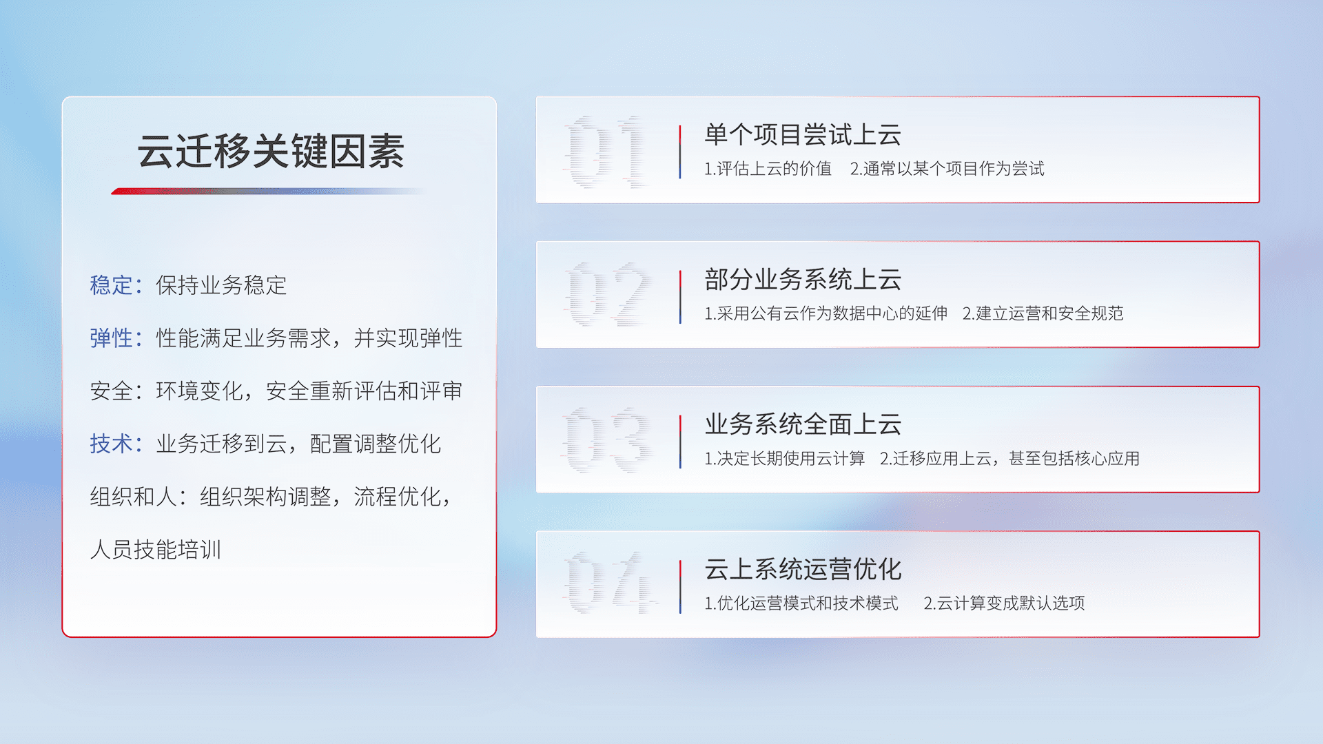 结合实际业务,,,从规划设计、、云平台选型、、云原生改造、、数据迁移、、集成交付,,,,迁移全过程为客户识别最佳上云路径,,,,做好风险识别管理,,,设计网络架构、、、、身份权限、、、、安全审计合规、、操作审计、、、、日志审计、、监控告警策略、、、、多站点容灾设计等,,,对云上基础设施进行整体规划,,,,提升IT治理水平,,,以满足弹性、、、、高可用、、、、高性能的需求。。。