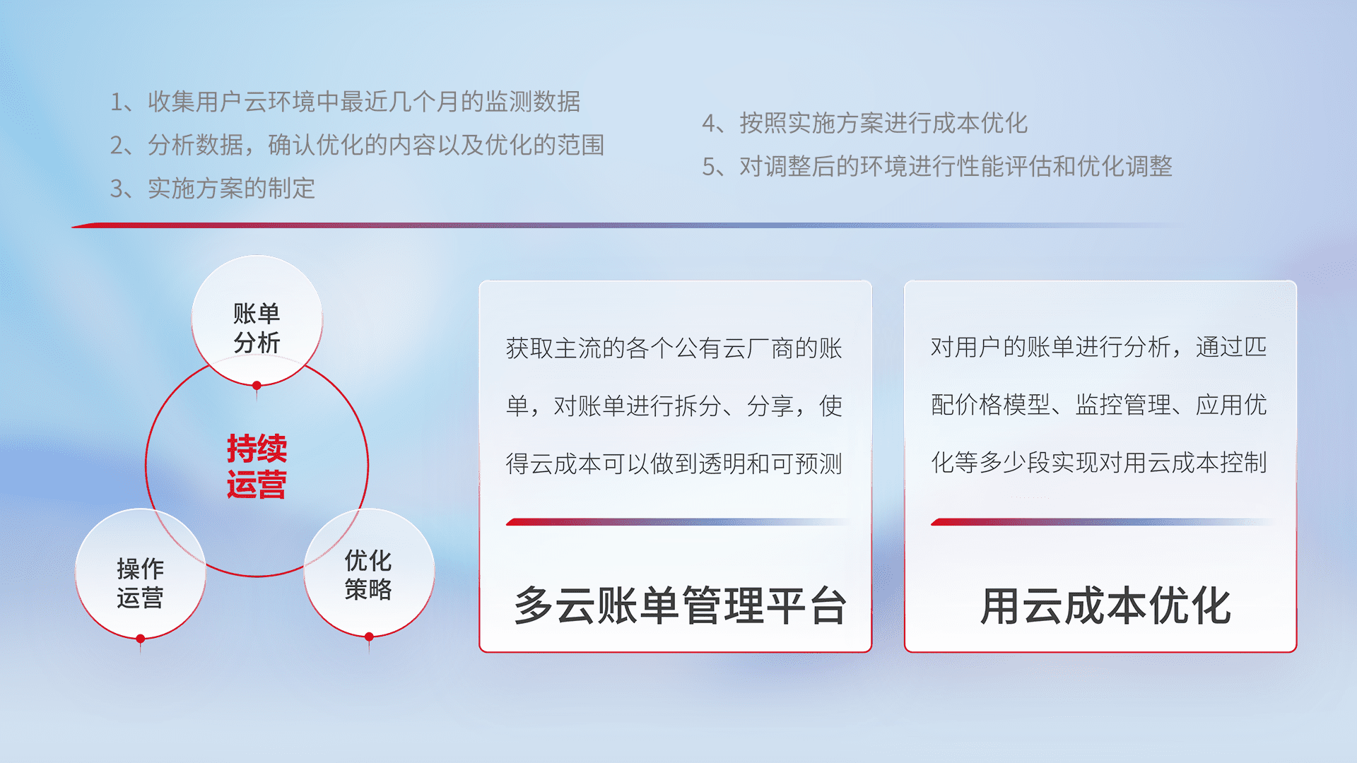 通过多云纳管,,,,以统一的资源数据模型把客户的云资源进行抽象和封装,,,,进而实现对多云资源的统一操作,,,,保障云资源管理的可靠性、、、稳定性与可用性。。。。量身定制化运维内容,,配置、、、、开发运维、、、、补丁管理、、、、备份、、监控、、认证和访问管理、、、、审计和日常巡检等,,,保障在用云过程中的可靠度,,,稳定度以及高可用率。。。